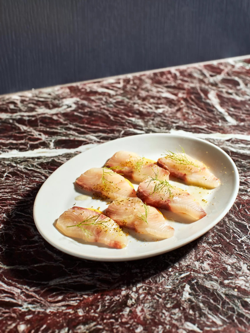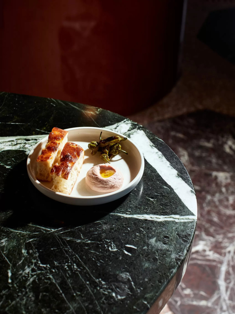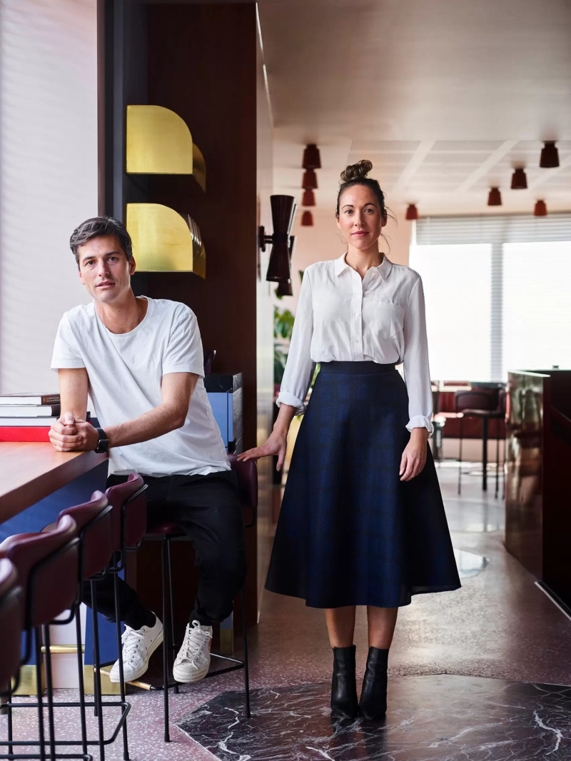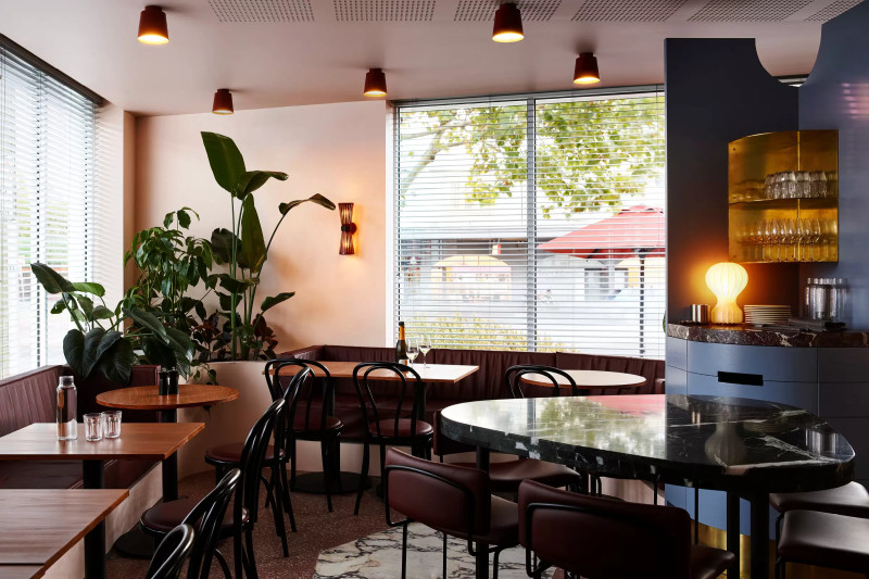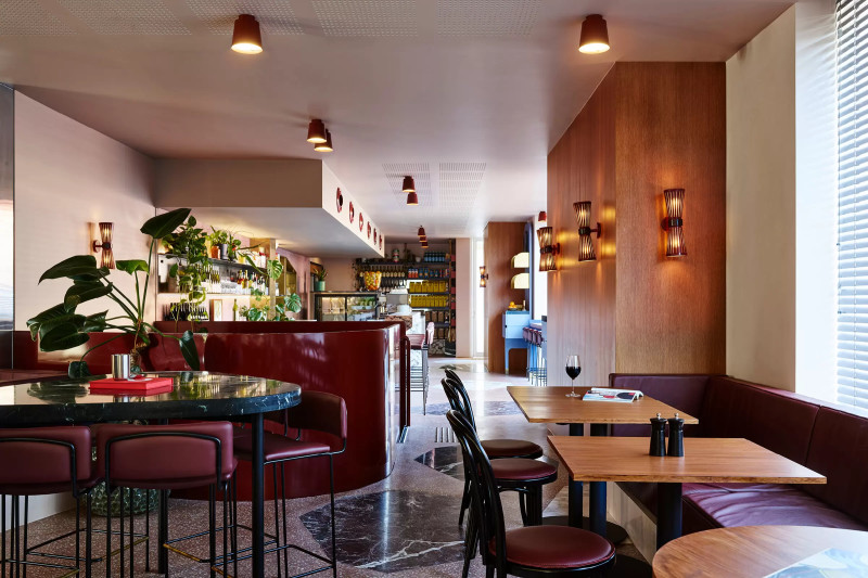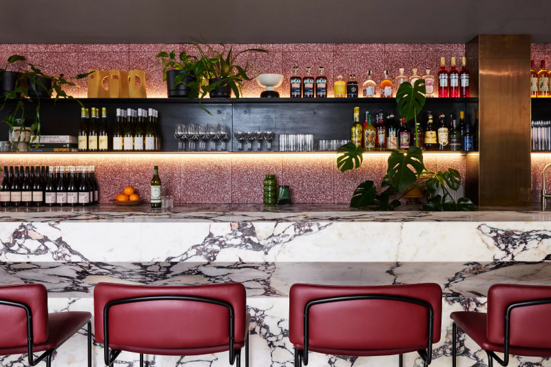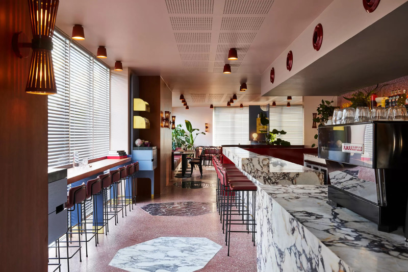 Created in collaboration with Flack Studio, the restaurant provides a space for residents in the apartments above to connect with each other and the local community. Raspberry terrazzo flooring, red steel stairs and burgundy banquette-seating were playfully paired to form a design that feels tactile, vibrant and effortless.