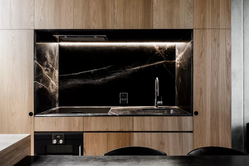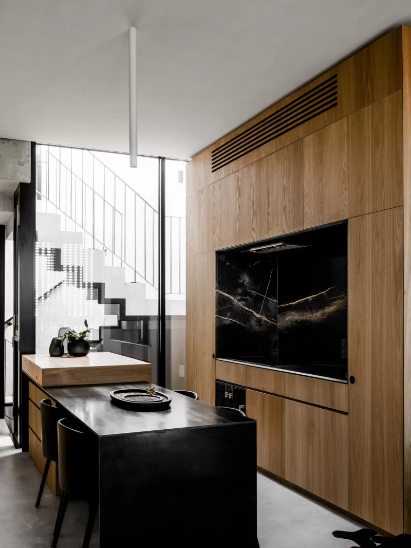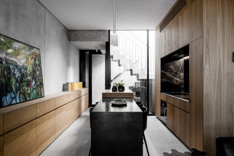 Focusing on two residences allowed for extensive levels of customisation and personalisation by occupants, to ensure the offering would meet their needs across a long span of time. The material palette of blackened steel, raw concrete and timber makes reference to the area’s industrial past and provides light-filled interiors across the five storeys, while the generous stairwell ventilates the building.
