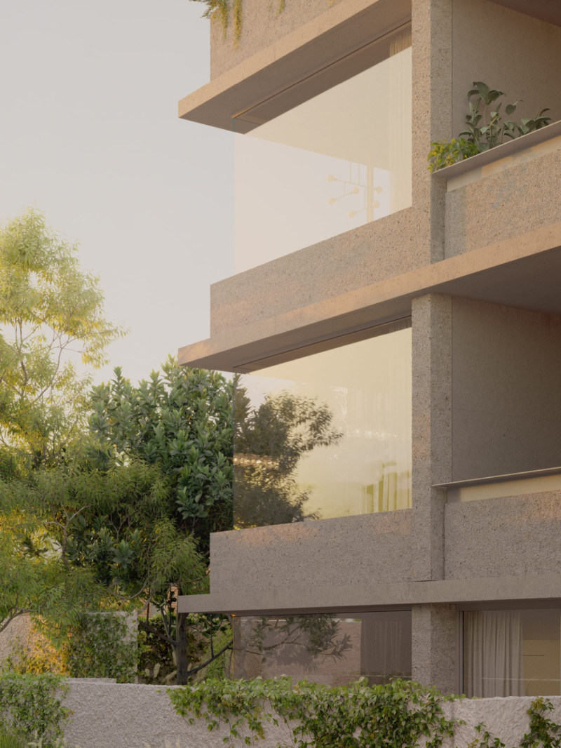 An exercise in balance and restraint, Plant Street is defined by solid, textural forms tempered by layers of greenery. Designed in collaboration with local architecture practice RITZ&GHOUGASSIAN, the building is underscored by a mix of textured concrete render and smooth slab edges that creates moments of depth and difference, while horizontal planes punctuate the façade at various heights.