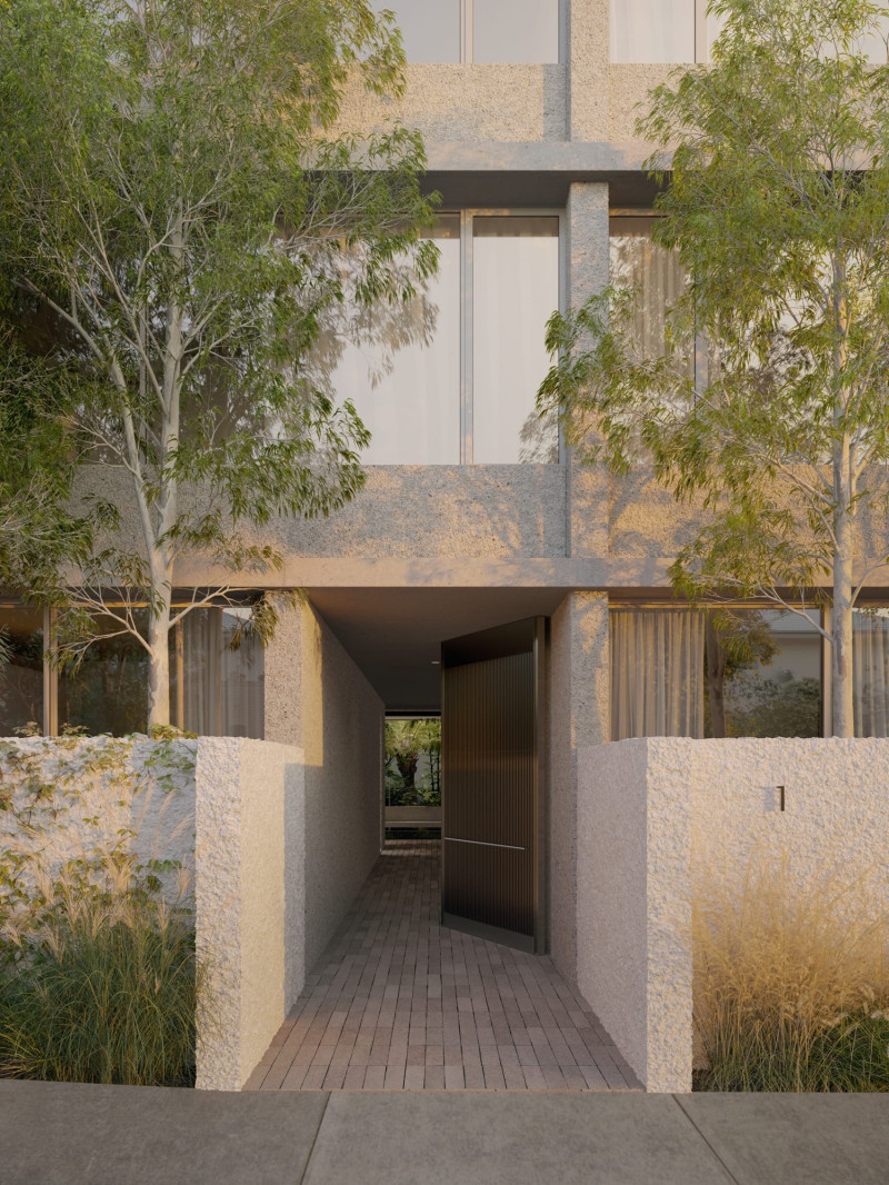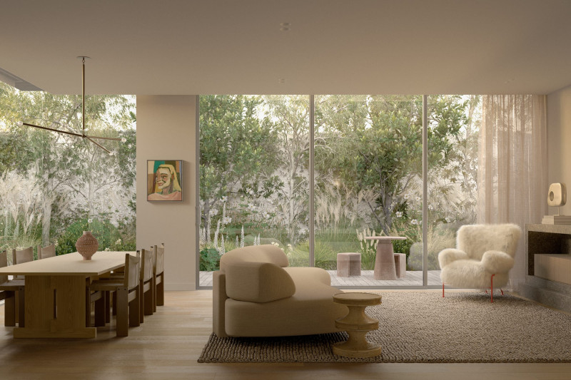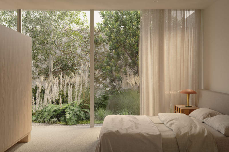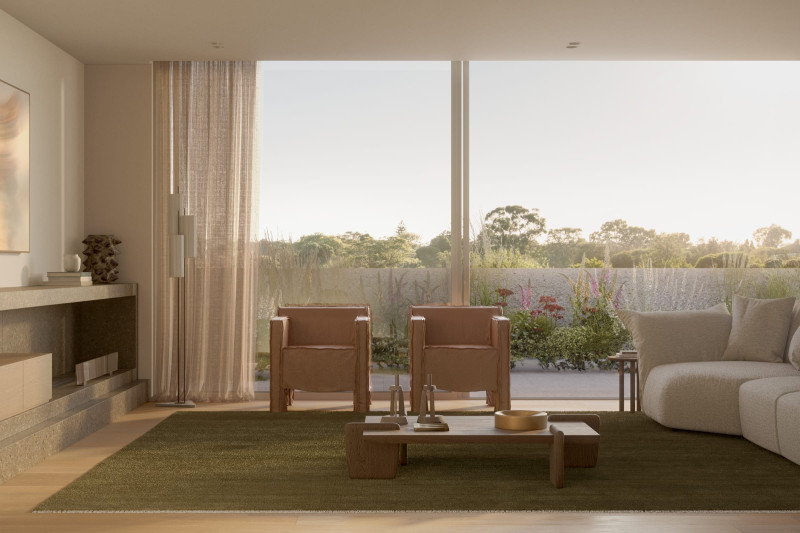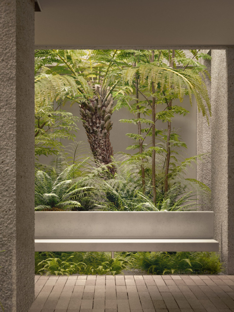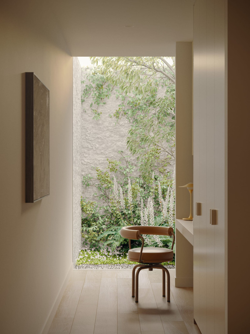 Intended to soften the built form and unite the architecture, interiors and outdoor areas, the landscaping features a dynamic mix of deciduous plants and trees that will shift across the seasons. These tactile and emotive outdoor areas are crafted by Acre, an award-winning multidisciplinary practice based in Collingwood.