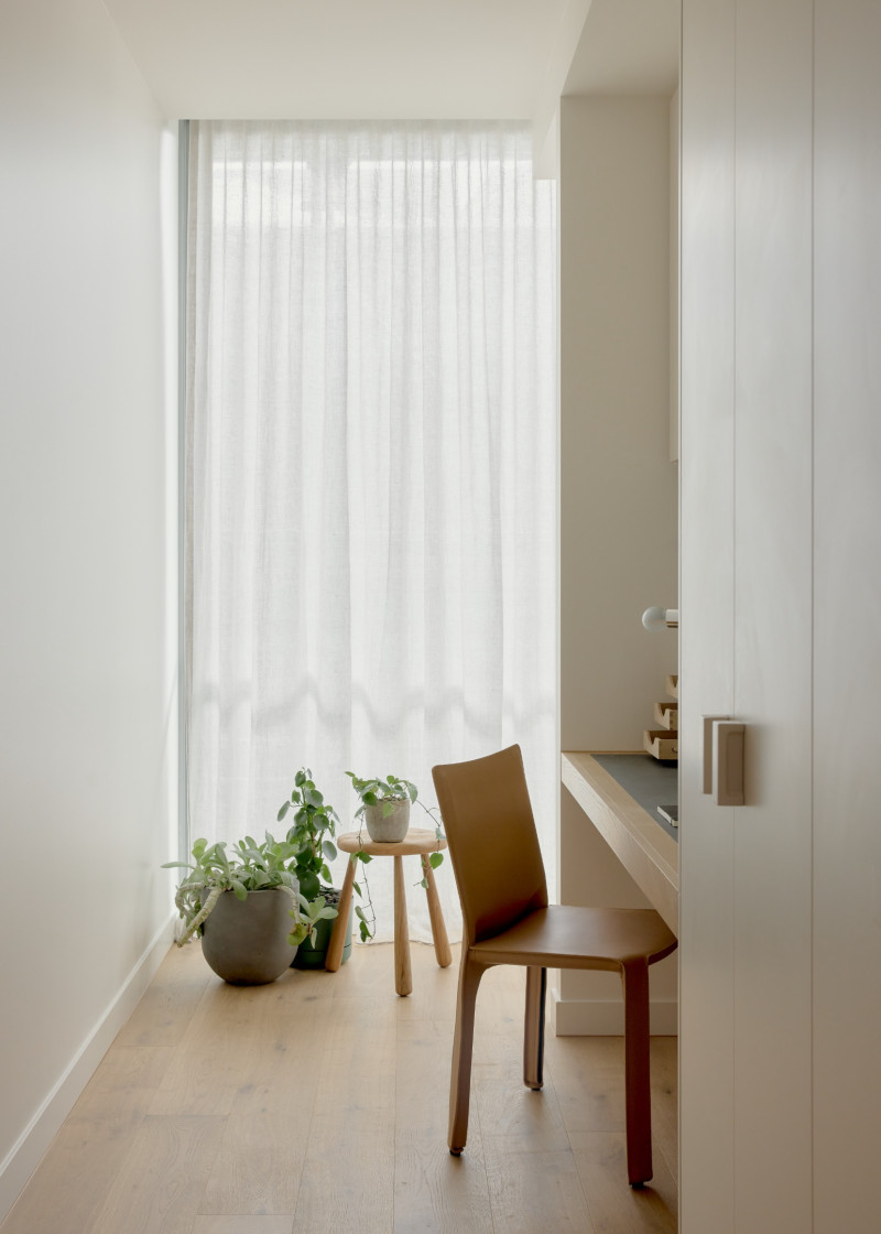 Plant life envelops the building and internal open-air atrium to gently filter the streetscape without creating disconnection from the neighbourhood. This confluence of architectural detailing and thoughtful landscaping allows for generous views and apertures towards the surrounding gardens and nearby suburbs.